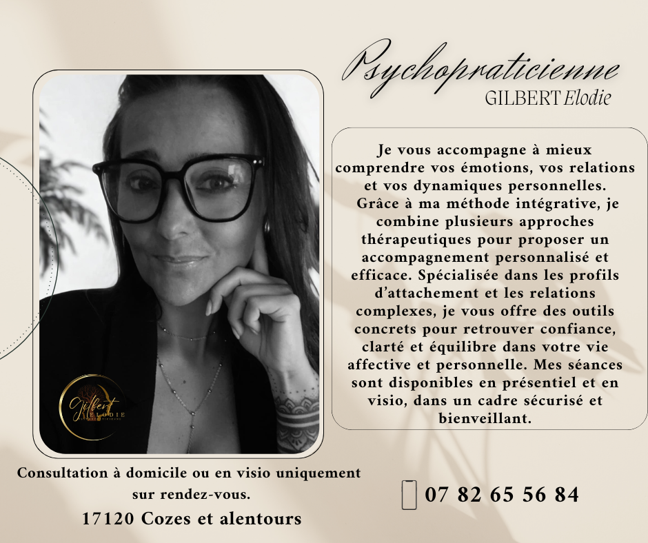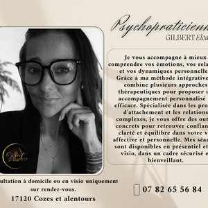 GILBERT Elodie psychopraticienne, professionnelle certifiée de la santé mentale. Je vous aide à explorer vos pensées, émotions et comportements. Mon rôle est de vous soutenir dans votre parcours de développement personnel, de gestion du stress, de résolution de conflits ou de surmonter des difficultés émotionnelles. Pour cela j’utiliserai différentes approches thérapeutiques, qui peuvent inclure la thérapie cognitivo-comportementale, la psychanalyse, l'approche systémique, la psychologie positive, La Gestalt ou d'autres méthodes adaptées aux besoins spécifiques de chaque patient.